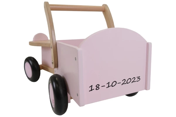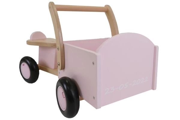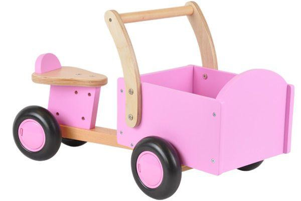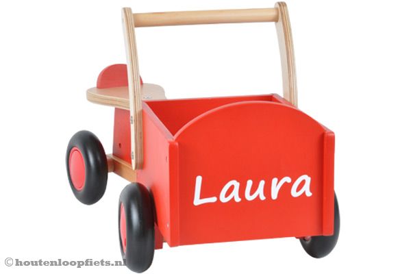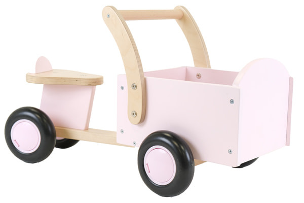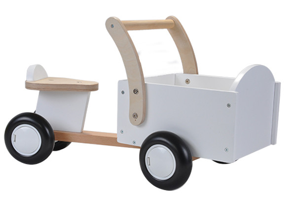 Deze retro groene bakfiets is van Bandits & Angels. Geschikt voor kids vanaf 1 jaar. De vier wielen maken deze loopfiets zeer stabiel! Bovendien zijn ze geluidsarm en krasvrij. De duwstang, voorzien van stuurbegrenzer, stuurt soepel en heeft een hoogte van 39 cm. Het zadeltje heeft een hoogte van 22,5 cm en heeft een veilig opzetstukje tegen het afglijden. Welk speelgoed mag mee in de bak?